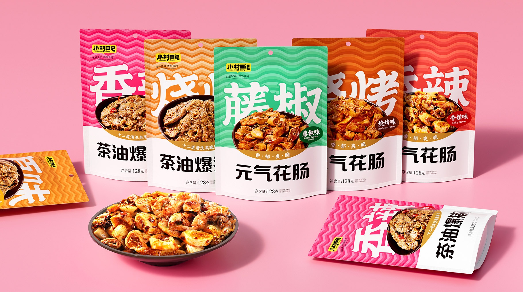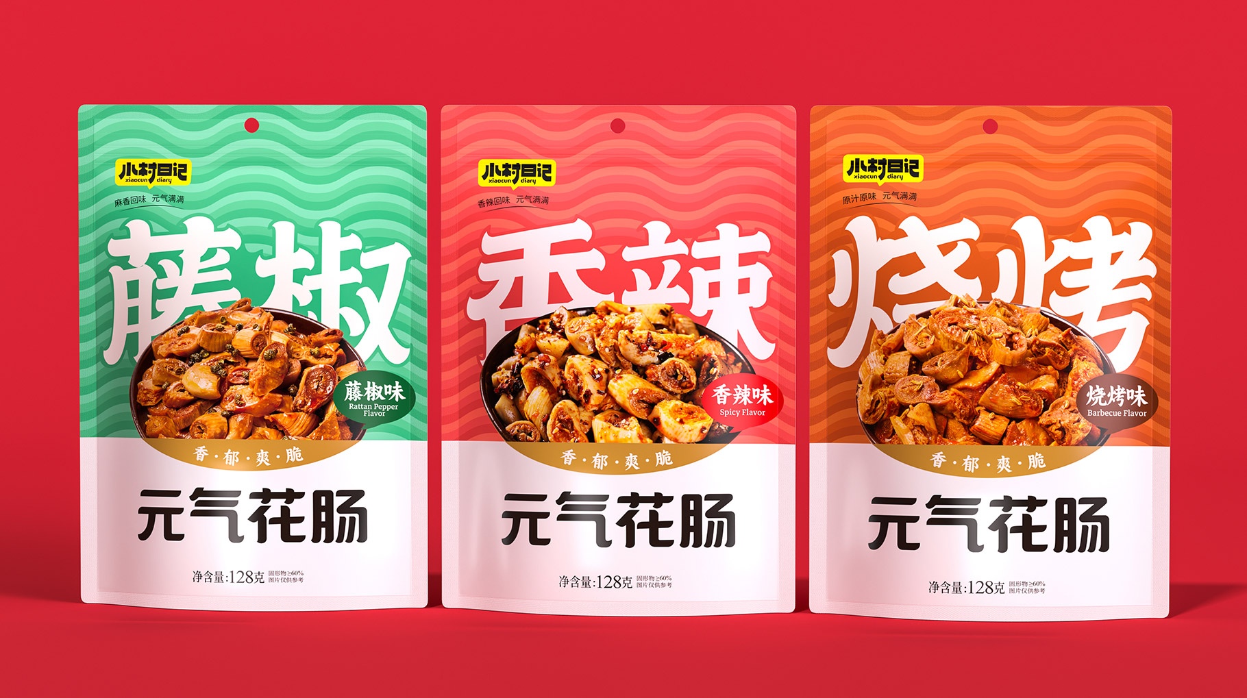 一、口味是設(shè)計休閑預(yù)制食品產(chǎn)品包裝時需要考慮的重要因素之一。口味的信息傳遞是從視覺上喚起消費者對產(chǎn)品的第一認(rèn)知。所以小村日記的花腸及豬肺類產(chǎn)品第一思考設(shè)計核心需求是喚起消費者的味覺欲望。