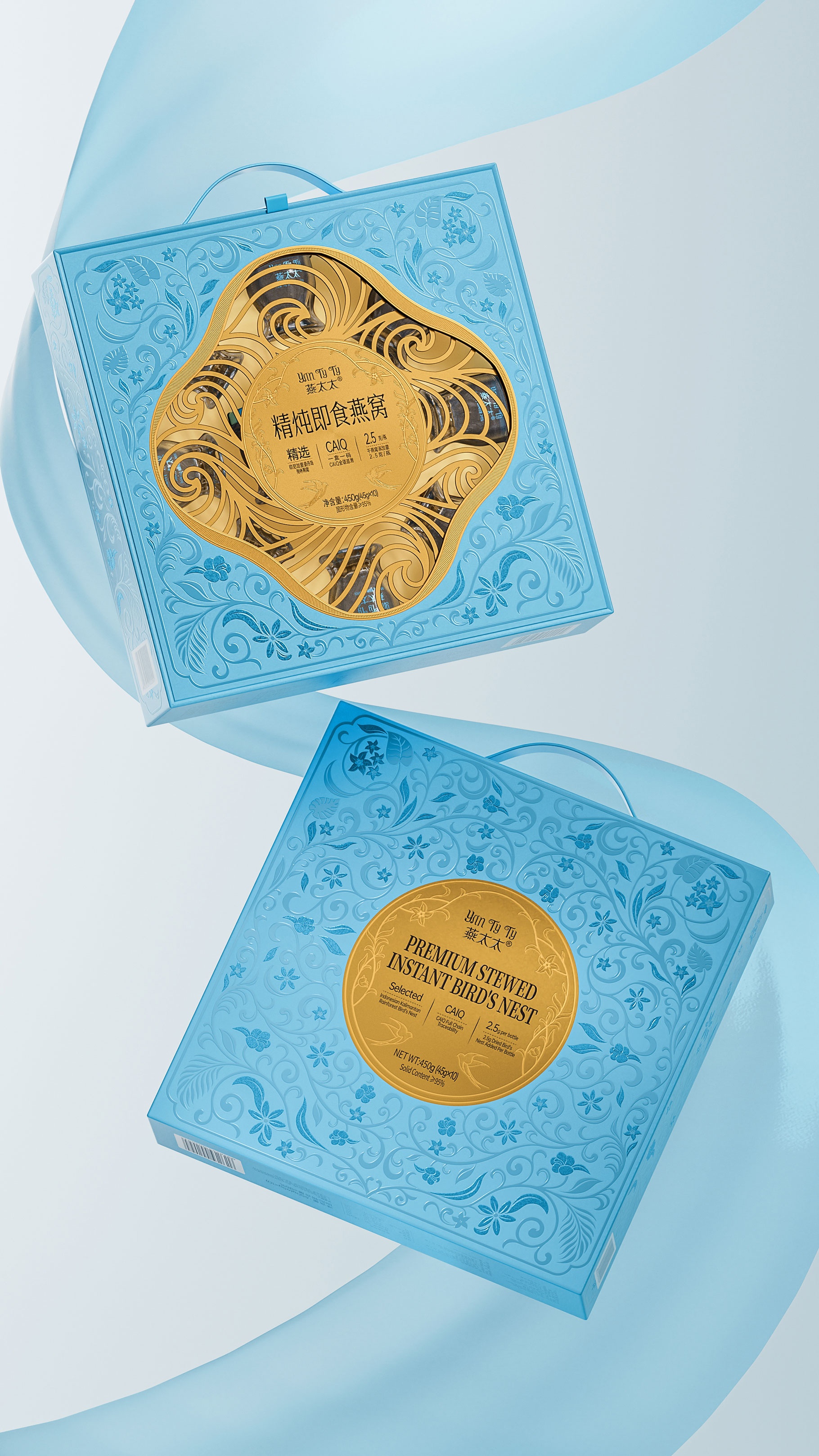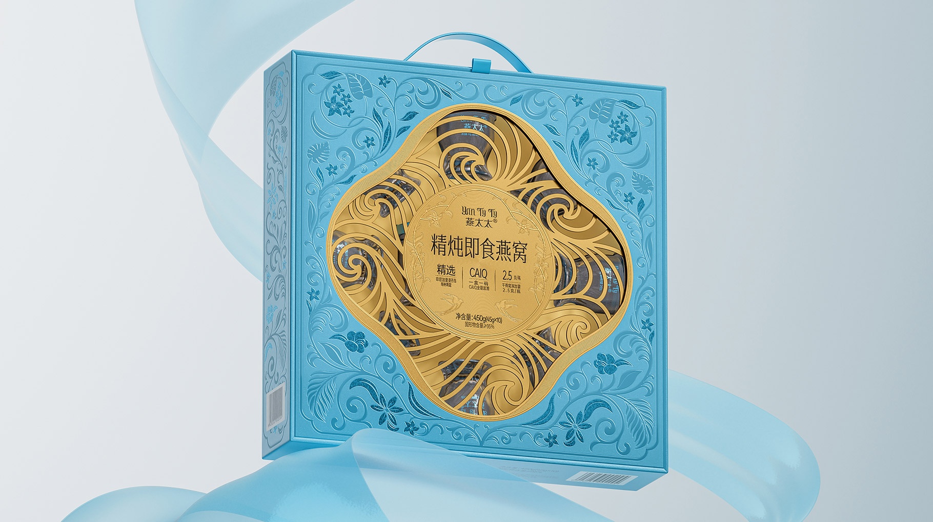 整體包裝創意以獨創三層視覺敘事:中部采用東方園林“框景”手法打造鏤空視窗,湖藍色藤蔓紋樣層疊延展,再現雨林生態的呼吸韻律,虛實交錯間透現燕窩瑩潤質感。