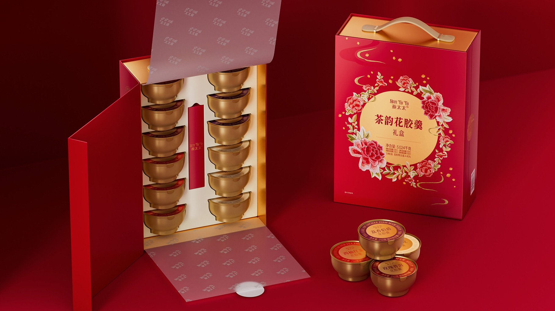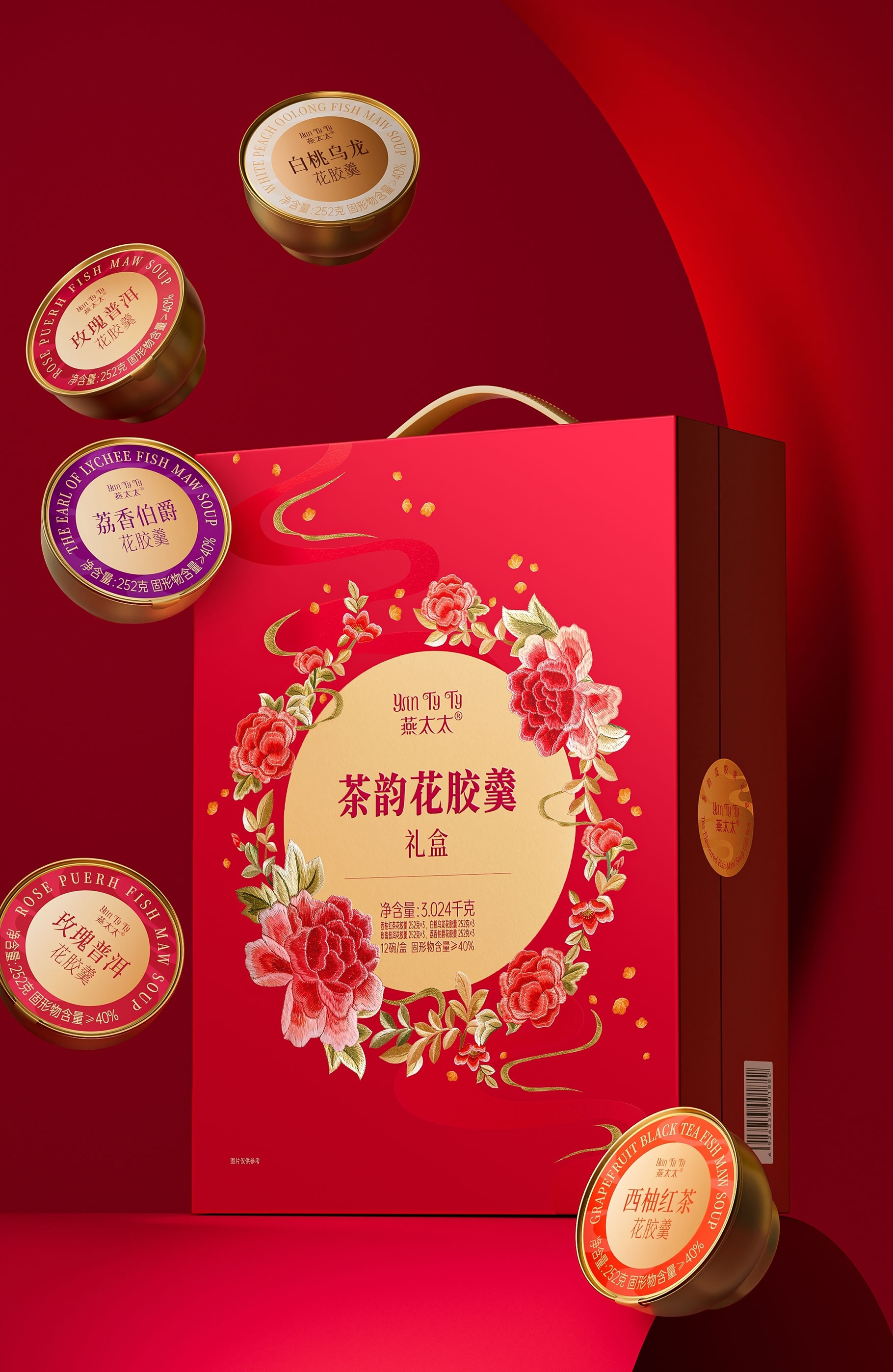 "燕太太"為山姆會員店專供的茶韻花膠羹禮盒:以刺繡工藝為核心,融合花與茶香圖騰元素的中秋花膠羹禮盒包裝。此設(shè)計旨在通過精細的刺繡技藝,展現(xiàn)自然之美、茶香之韻與中秋佳節(jié)的和諧氛圍,讓收禮者在享受美味的同時,也能感受到一份來自傳統(tǒng)文化的藝術(shù)享受與情感傳遞。