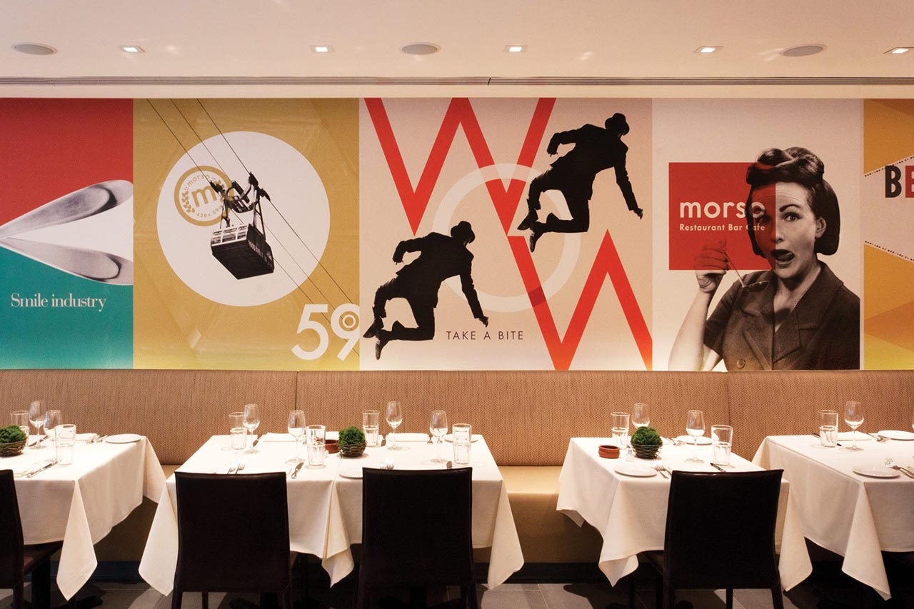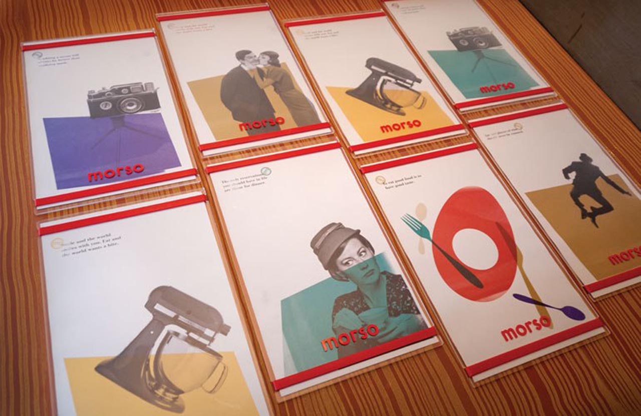 就像家庭式的菜肴一樣,我們想要設計一個讓人感到舒適和放松的空間。菜單簡短而充滿活力,可以保持對話流暢。我們用大膽,明亮的海報填充墻壁,并飾有厚厚的厚臉皮,如“嘴里滿是沉默的金色”和“吃,喝,做Morso。”這是一種食客所喜愛的氛圍,適合廚師Pino豐富多彩的氛圍。個性完美。