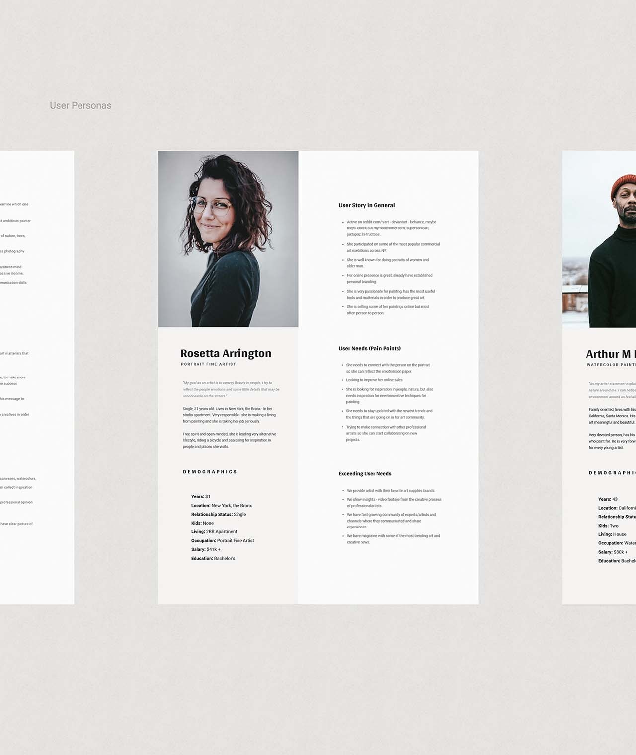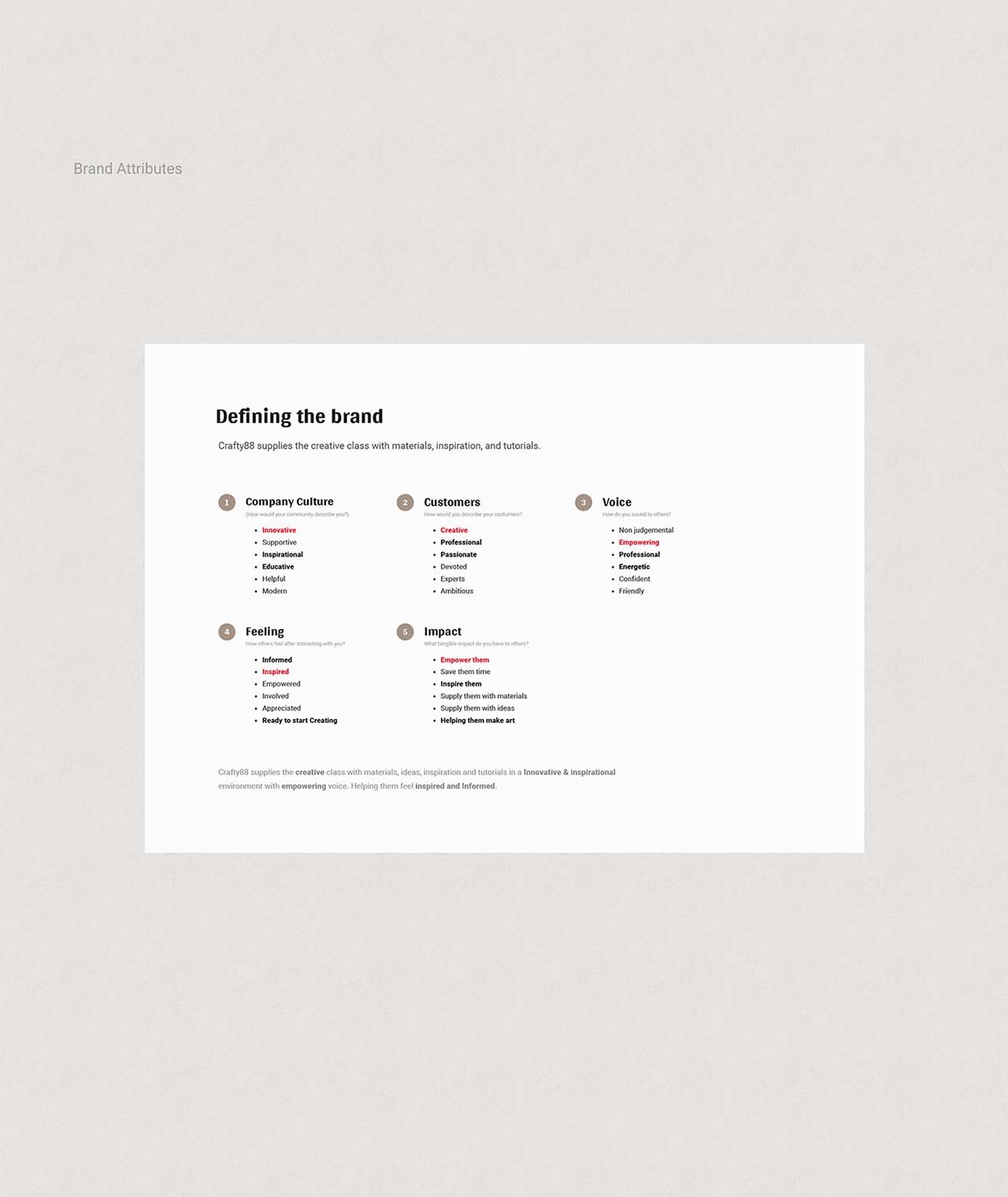 “無論你是畫家,雕塑家,剪貼簿師還是建筑師,你總是從空白的畫布開始,用你的想象力填寫它”Crafty88真的是關(guān)于這一點,是藝術(shù)家的起點和工具。在我們?yōu)榇隧椖吭O(shè)定目標后,我們概述了理想的用戶角色,并定義了品牌屬性。我們努力吸引的客戶是專業(yè)藝術(shù)家,他們毫不猶豫地使用高質(zhì)量的工具和材料。